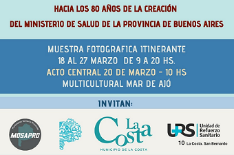 | 11.03.26 “Territorios que cuidan”, la muestra fotográfica itinerante que conmemora los 80 años de la creación del ministerio de Salud de la Provincia de Buenos Aires y que propone recorrer distintos momentos e hitos en la construcción del sistema sanitario bonaerense, se pondrá en marcha en el Espacio Multicultural de Mar de Ajó, de Yrigoyen y Sacconi.